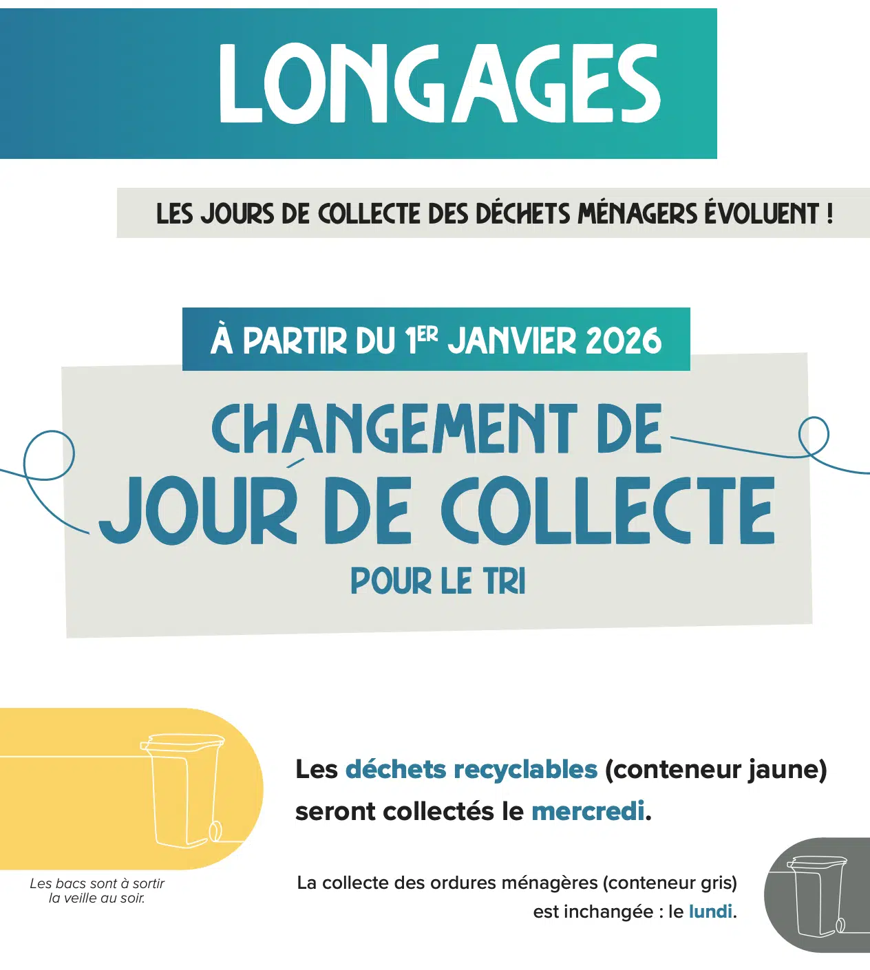 En effet à Longages : la collecte du tri selectif aura lieu le mercredi au lieu du jeudi à compter du 1er janvier 2026