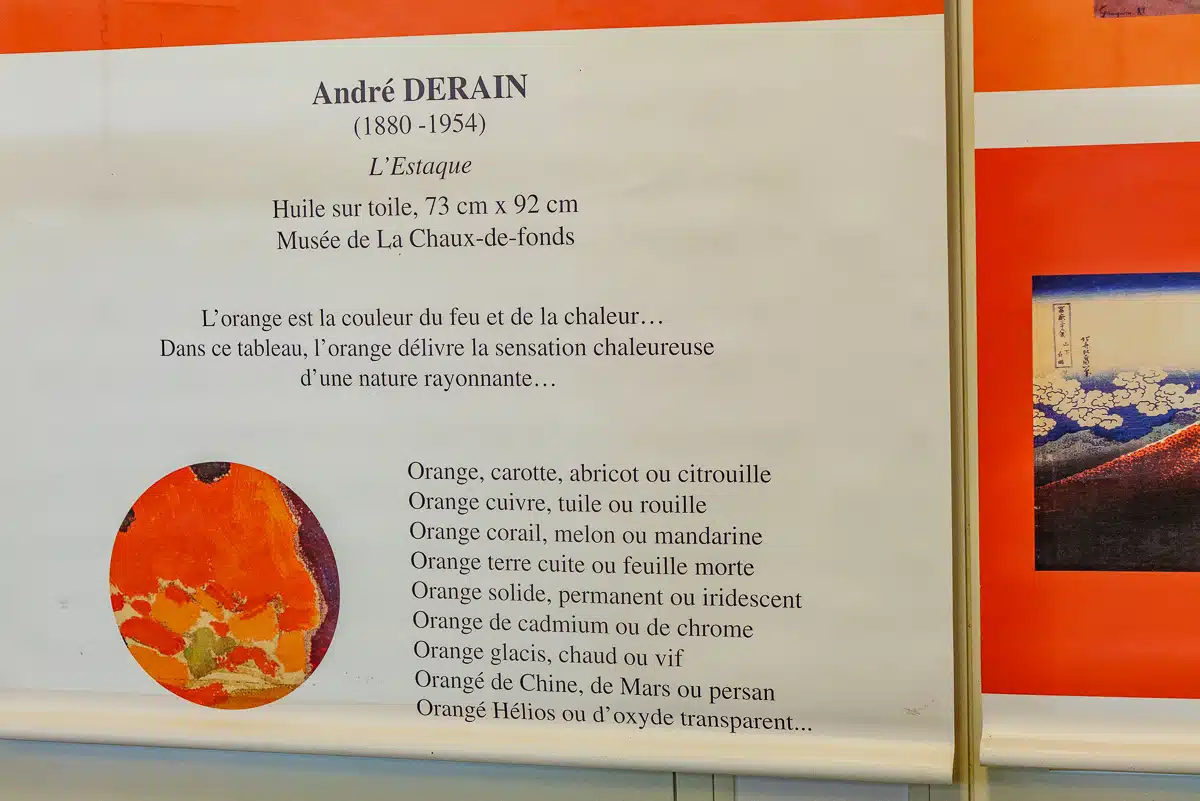 Un panneau présente une œuvre choisie pour sa couleur dominante, un second propose 3 variations de cette même couleur chez 3 artistes différents.
