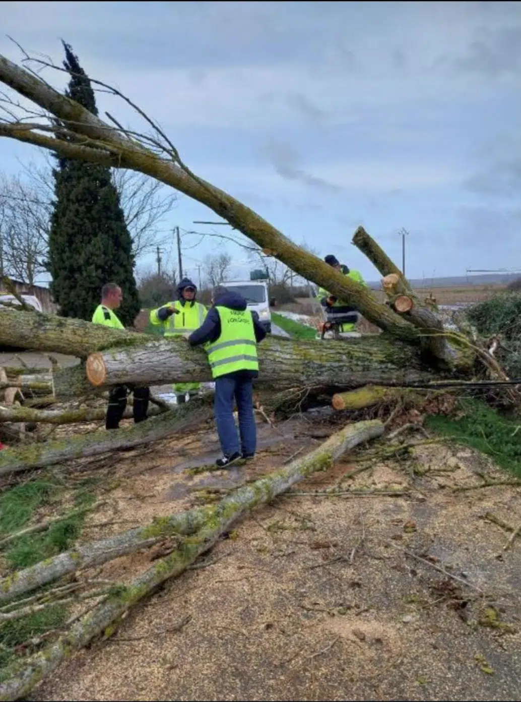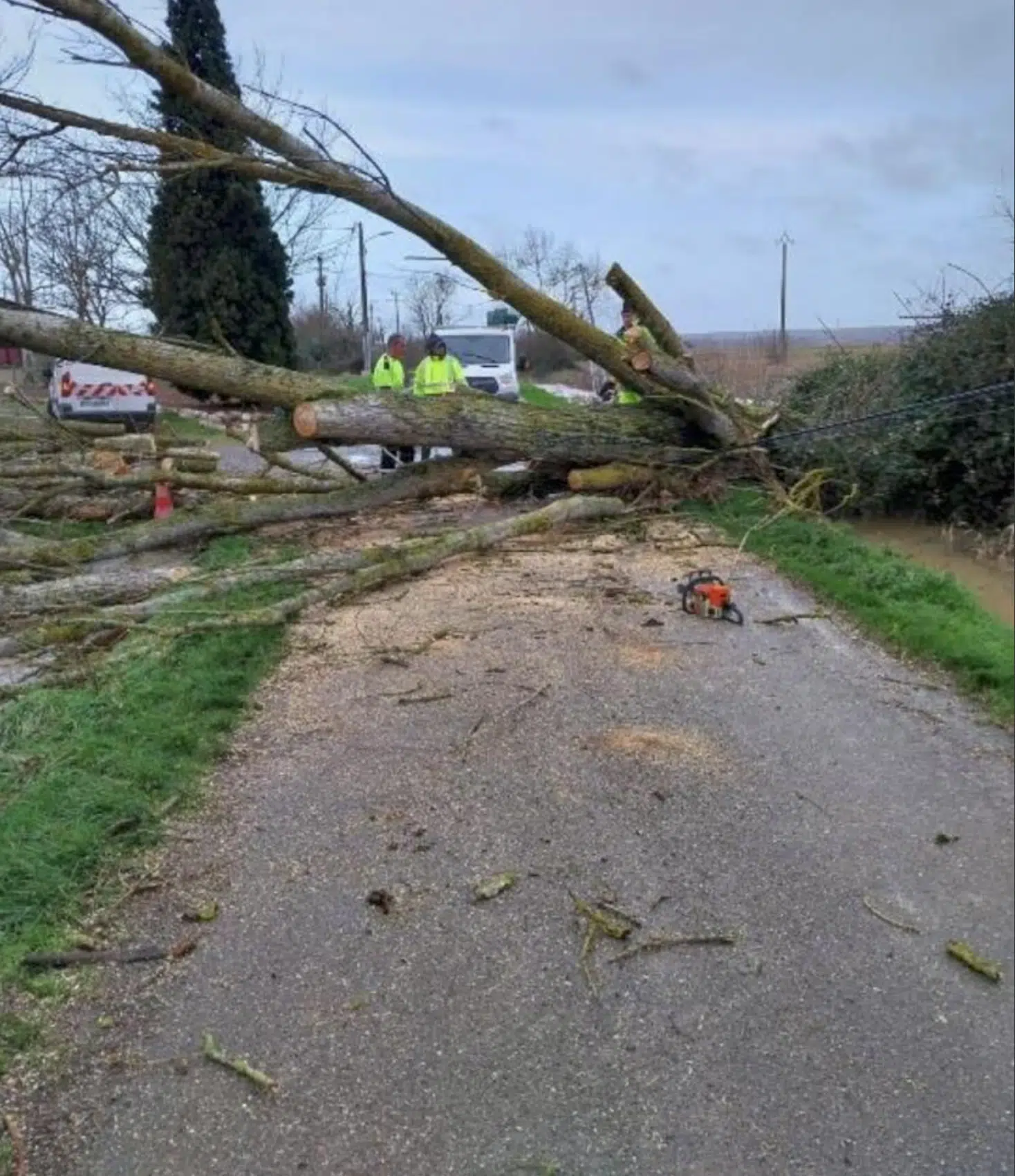 Des travaux de tronçonnage sont en cours sur Chemin des Communaux qui est actuellement fermé à la circulation suite à la chute de plusieurs arbres.