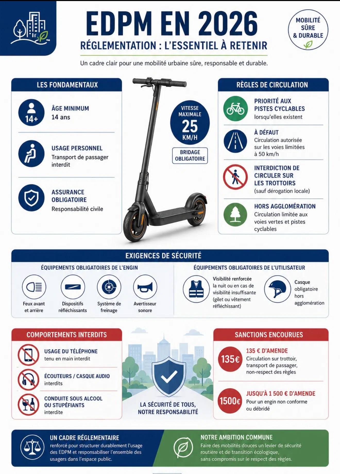 La définition d’un EDPM est la suivante « un véhicule sans place assise, conçu pour une seule personne, équipé d’un moteur non thermique (souvent électrique), avec une vitesse maximale limitée à 25 km/h (et supérieure à 6 km/h). »